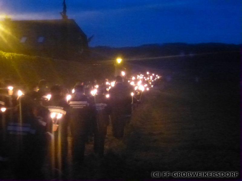 Nach einigen Begrüßungsworten der Ehrengäste, wurden mitgebrachte Fackeln entzündet. Im Rahmen einer Fackelwanderung ging es weiter zum Feuerwehrhaus Ollern. Dort wurden die Jugendgruppen mit Burger, Muffins und Getränken verköstigt.