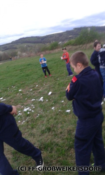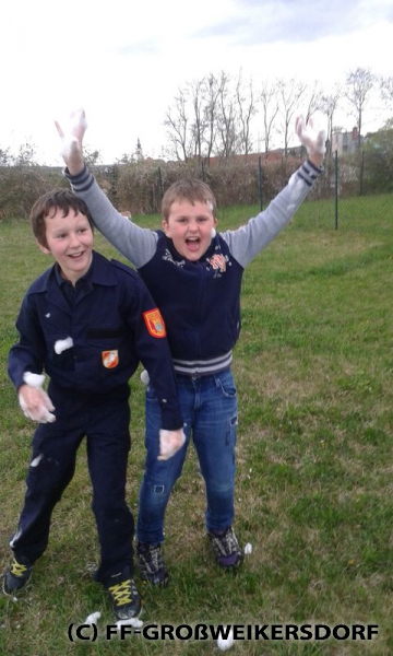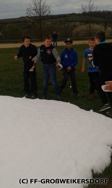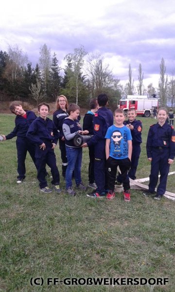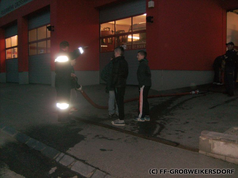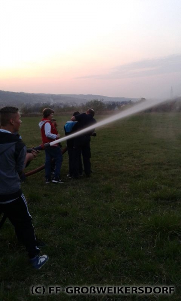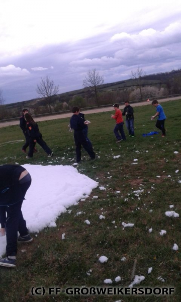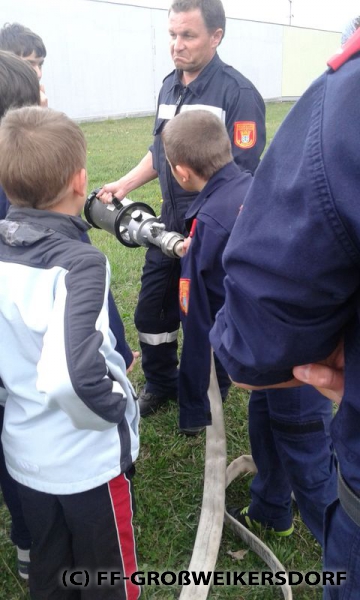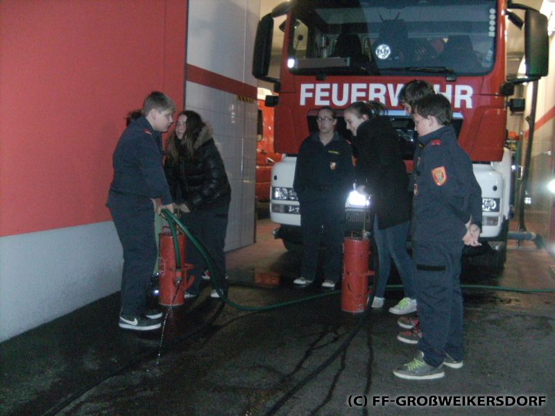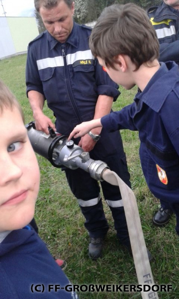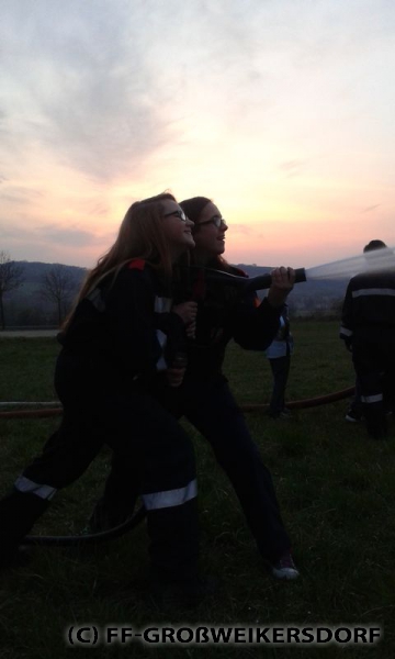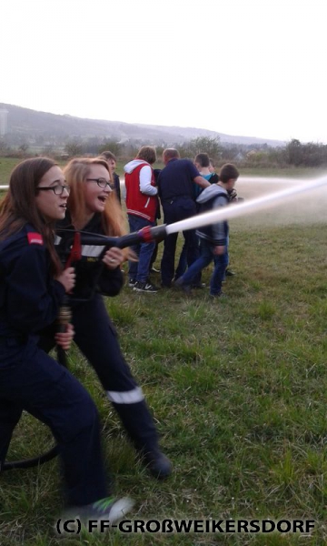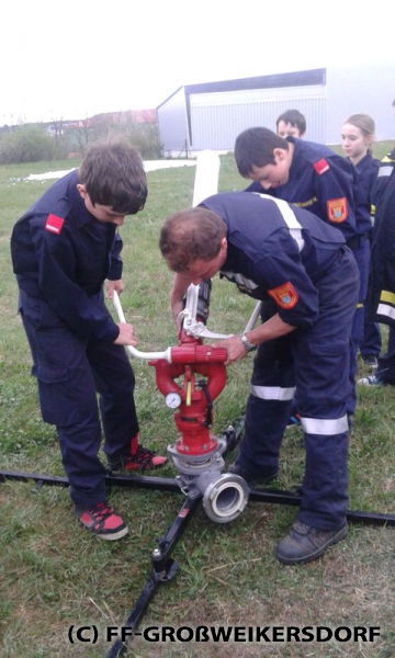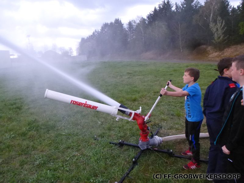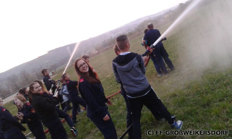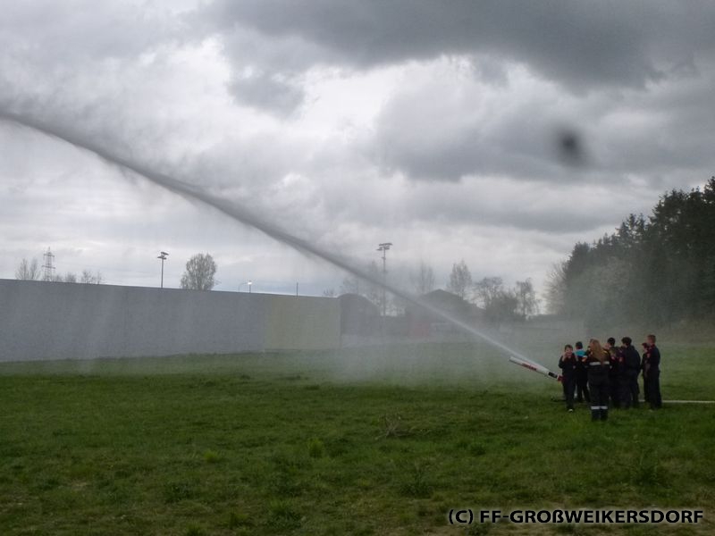 Am 25. März wurden diverse Wasserführende Armaturen vor dem Feuerwehrhaus im Selbststudium erforscht, und auch erste Löschangriffe mittels Löschleitung oder Kübelspritze wurden durchgeführt. Bereits eine Woche später brachen die Jugendlichem mit dem Rüstlöschfahrzeug zum Gemeindebauhof auf, um weitere Utensilien zu testen. Die Jung-Florianis durften am eigenen Leib erfahren, welchen Kraftaufwand es erfordert, das HD-Rohr der Schnellangriffseinrichtung festzuhalten, und auch die mittels Hydroschild erzeugte Wasserwand hatte staunende Gesichter zur Folge. Am dritten und letzten Übungsabend wurde vor dem Gemeindebauhof ein Schaumteppich erzeugt, welcher unverzüglich für eine wilde Schaumparty genutzt wurde. Zu guter Letzt hieß es „Löschen XXL“ mit dem Wasserwerfer des Rüstlöschfahrzeuges.